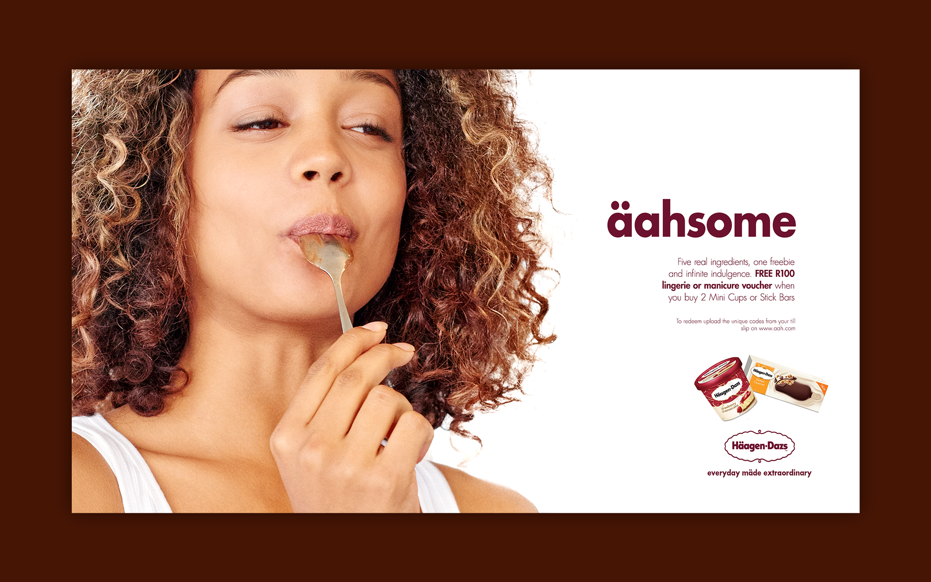 To encourage sales of Häagen-Dazs Mini Cups/Stick Bars and in turn get more fridge space in store; this campaign offered a free lingerie or manicure voucher when you buy 2 Mini Cups or Stick Bars. The concept was a little play on “aah” which is what people say after an indulgent mouthful, giving the äah unique to Häagen-Dazs, a South African twist.